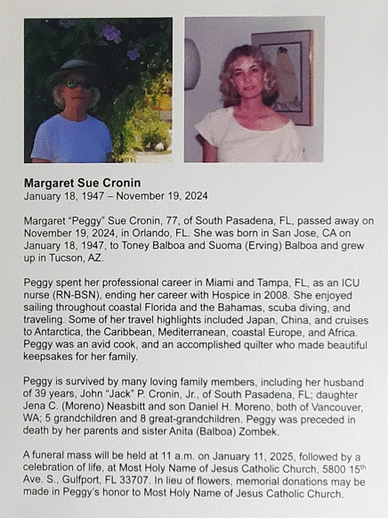Celebration of Sue’s life and a reception was held in Winter Garden, FL on Sunday, November 3.